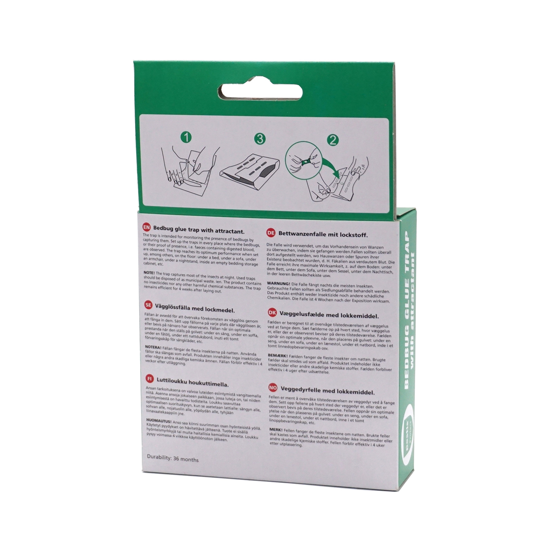 Produktklasse: Die Falle ist speziell entwickelt, um Schädlinge effektiv anzulocken und einen Befall frühzeitig zu erkennen. Klebefalle zur Identifizierung und Überwachung des Vorkommens von Schädlingen. Wenn ein größerer Befall festgestellt wird und sich nicht durch Maßnahmen wie Reinigung oder Einfrieren beheben lässt, können Bekämpfungsmittel eingesetzt werden. Das Produkt ist kein registriertes Biozid.