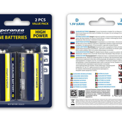 Esperanza D-Batterien sind alkalische Einwegbatterien mit langer Laufzeit und konstanter Leistung, geeignet für Geräte mit hohem Stromverbrauch. Sie werden häufig in Produkten wie Radios, tragbaren Lautsprechern, größeren Spielzeugen und elektrischen Fallen verwendet. Die Batterien haben eine lange Haltbarkeit und lassen sich sicher auf Vorrat lagern, bis sie benötigt werden.