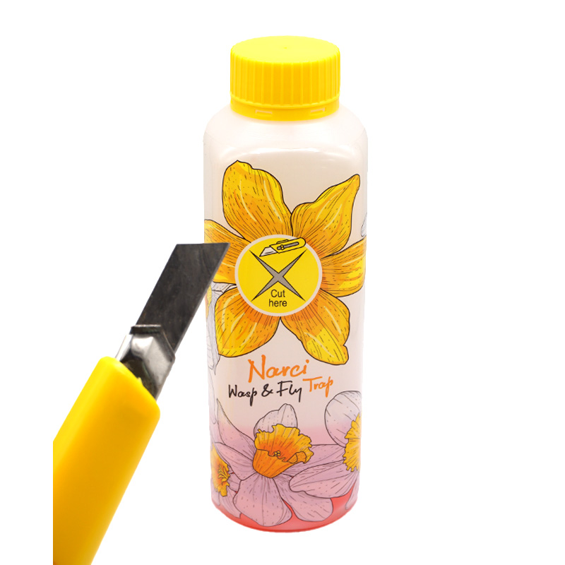 Stellen Sie die Flasche aufrecht hin und schneiden Sie an der Markierung auf einer Seite ein Kreuz ein. Montieren Sie anschließend den Kunststoffring, der in der Verpackung enthalten ist. Auf diese Weise entsteht die Öffnung, durch die die Insekten in die Falle gelangen sollen.