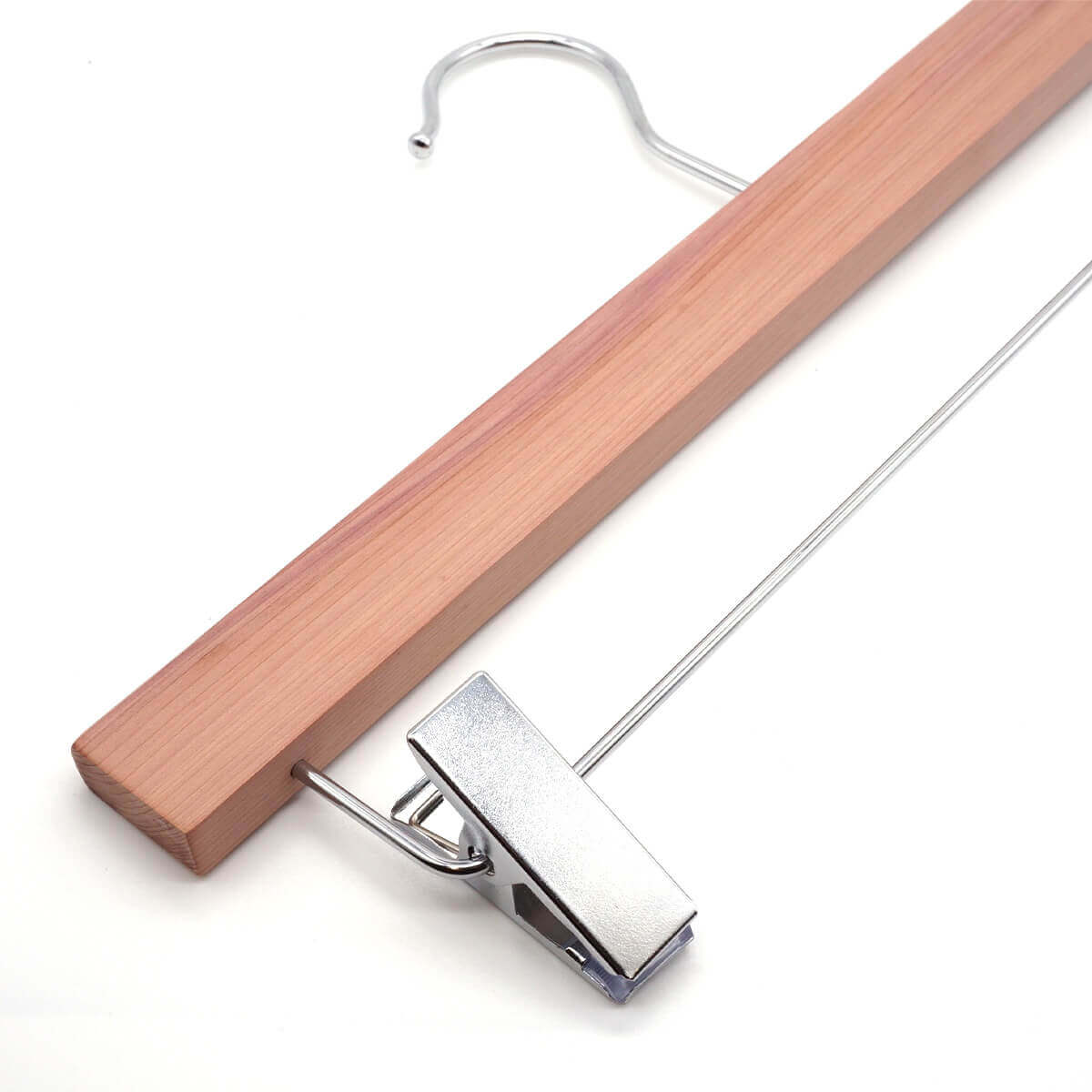 Hergestellt aus massivem Juniperus virginiana mit einer glatten, fein polierten Oberfläche, die schonend zu Stoffen ist. Das Zedernholz verströmt einen frischen, dezenten Duft und verleiht dem Kleiderschrank einen Premium-Eindruck. Stabile Clips mit gleichmäßigem Druck sorgen für sicheren Halt ohne Abdrücke. Perfekt für Anzughosen, Röcke und empfindliche Materialien, bei denen Form und Fall erhalten bleiben sollen. Der natürliche Zedernduft kann dazu beitragen, Textilschädlinge abzuschrecken und die Aufbewahrung frisch zu halten.