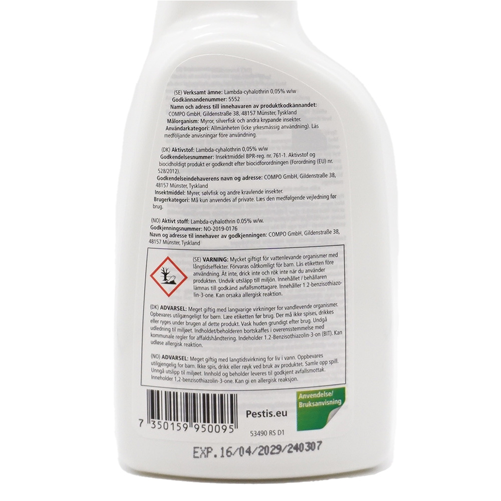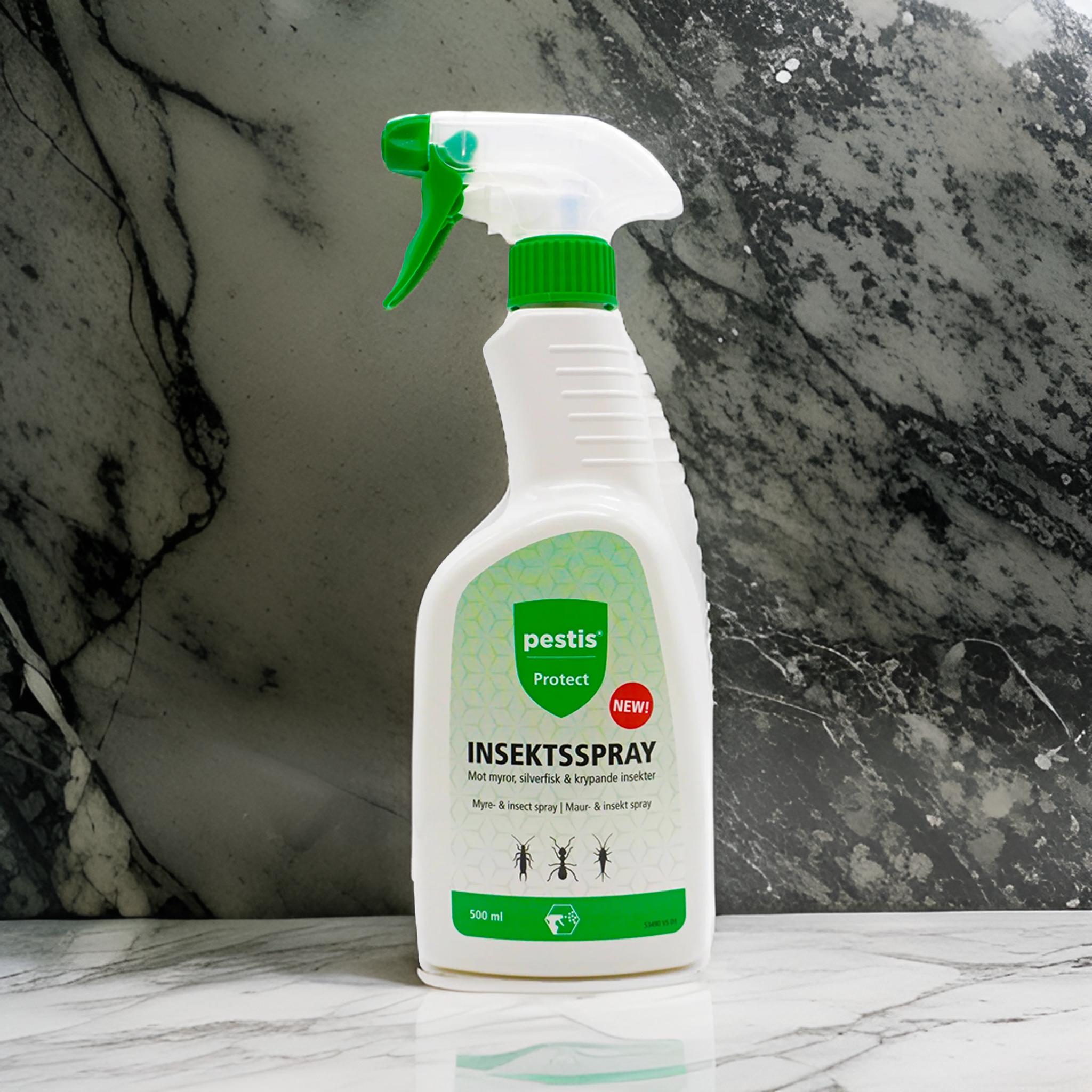 Pestis Protect® Insektenspray 500 ml ist ein starkes, gebrauchsfertiges Insektizid zur Anwendung gegen kriechende Insekten wie Silberfischchen, Ameisen, Kakerlaken und Asseln. Das Produkt enthält Lambda-Cyhalothrin – einen Wirkstoff mit nachweislich guter Wirkung unter normalen Bedingungen für bis zu 4–8 Wochen. Das Produkt eignet sich sowohl für den Innen- als auch Außenbereich und kann zum Beispiel in Küchen, Badezimmern, Kleiderschränken, entlang von Fußleisten, auf Steinflächen oder entlang von Hausfundamenten verwendet werden. Tests zeigen, dass die Insektenaktivität bis zu vier Wochen nach der Behandlung um über 99,5 % reduziert wird, bei Silberfischchen um 100 %.
