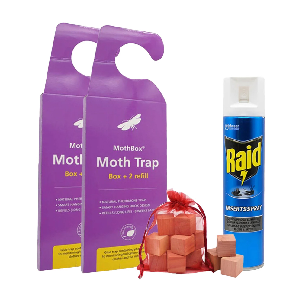 - 2× Mothbox® Mottenfalle*: Giftfreie und beliebte Mottenfalle, die Pheromone abgibt und Kleidermotten sowie Pelzmotten anlockt, die dann auf der Klebefläche im Inneren der Falle haften bleiben.