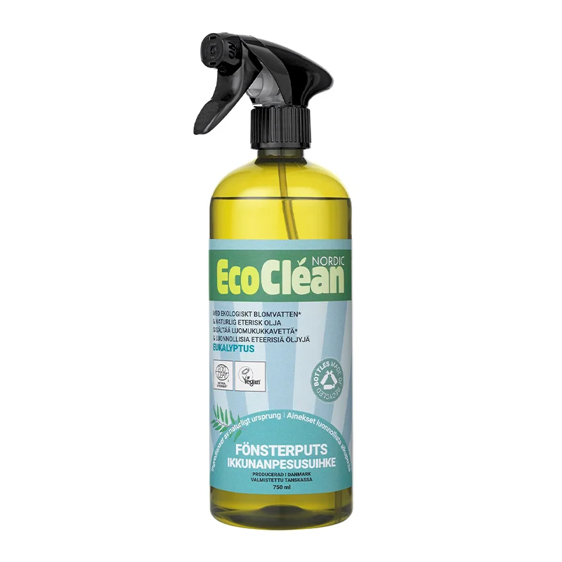 EcoClean Fensterreiniger mit Eukalyptus sorgt für streifenfrei saubere Glasflächen. Die ökologische Formel basiert auf natürlichen Inhaltsstoffen und ist frei von synthetischen Farbstoffen und Parabenen, was sie zu einer sicheren und umweltbewussten Wahl für den Haushalt macht. Direkt auf die Oberfläche sprühen und mit einem sauberen Tuch abwischen – das Ergebnis ist klar, frisch und angenehm duftend.