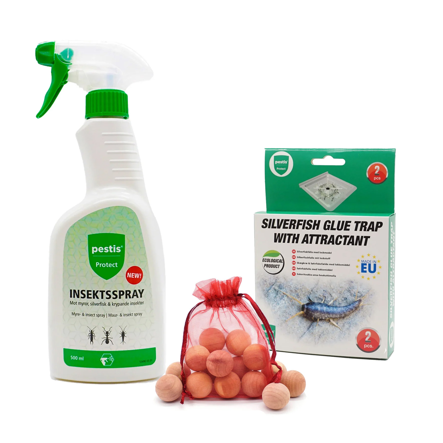 Dieses Wertpaket enthält eine Kombination von Produkten, um Silberfischchen zu bekämpfen und einen Schutz aufzubauen. Verwende Silberfischchenfallen zur passiven Erkennung und Überwachung, Insektenspray zur aktiven Behandlung und Zedernholz für einen angenehmen Duft.