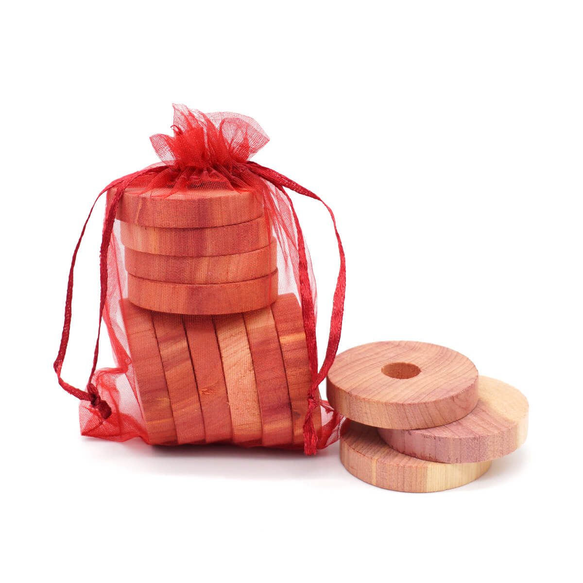 Handgefertigte Ringe aus massivem Rotzedernholz (Juniperus virginiana) mit charakteristischem Holzduft. Jeder Ring ist fein geschliffen für eine glatte Oberfläche und lange Lebensdauer. Das natürliche Aroma des Holzes hilft, das Umfeld in Kleiderschränken und Aufbewahrungsbereichen zu kontrollieren, sodass Textilien frisch bleiben. Rote Zeder ist dafür bekannt, Schädlinge wie Motten, Pelzkäfer und Silberfischchen abzuschrecken.
